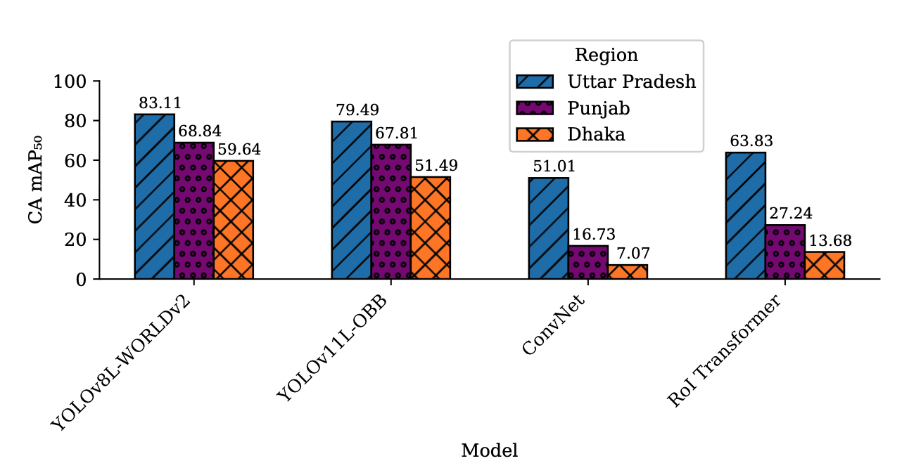 - YOLOv11L-OBB maintains best overall cross-region performance